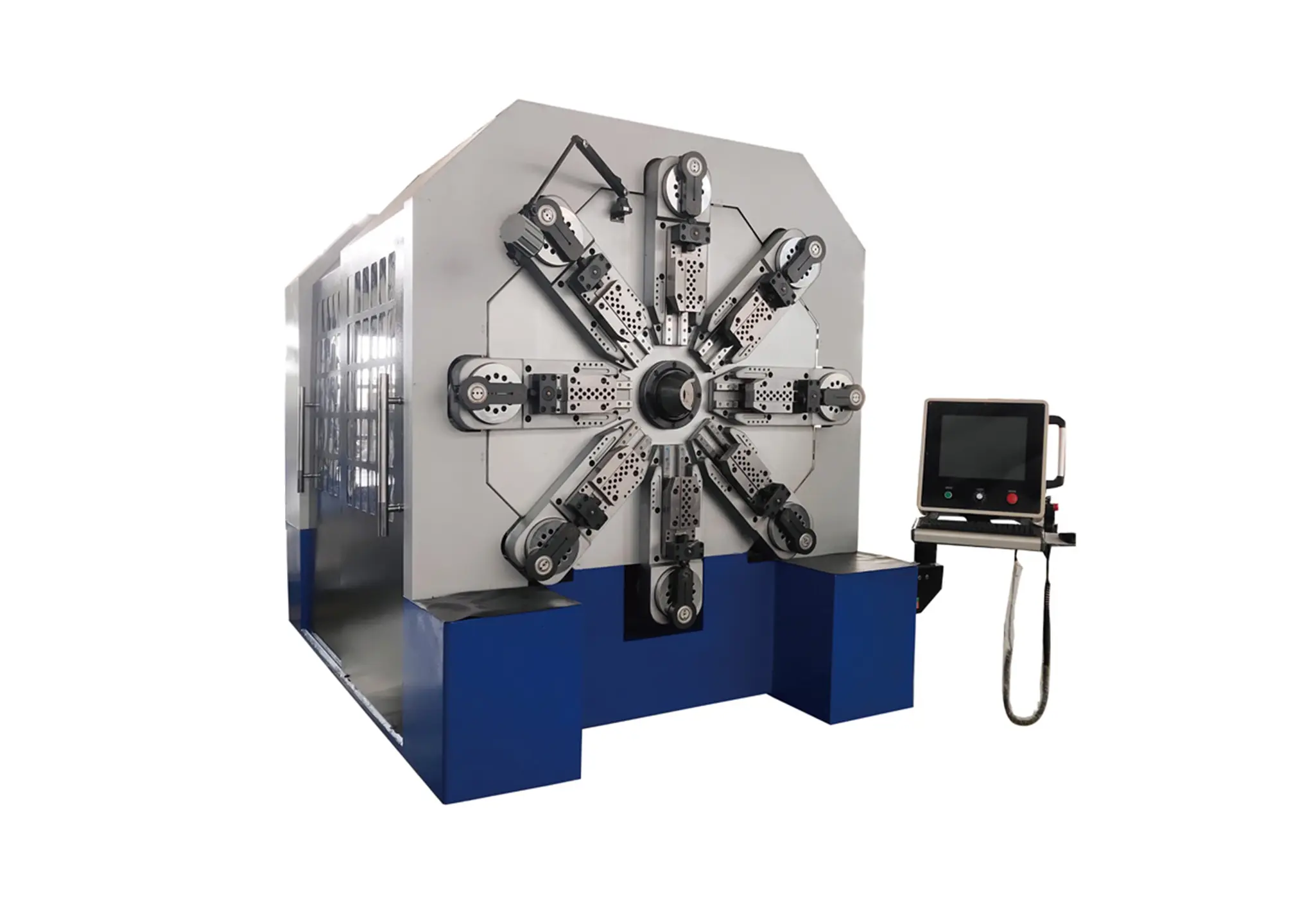 Многоосната CNC машина за формоване на пружини може да произвежда пружини с диаметър на телта от 0,2 до 20,0 мм. Машината за пружини без гърбичен механизъм използва уникален дизайн без гърбица, като всяка ос се управлява независимо от множество сервомотори и има отделно сервозадвижване.